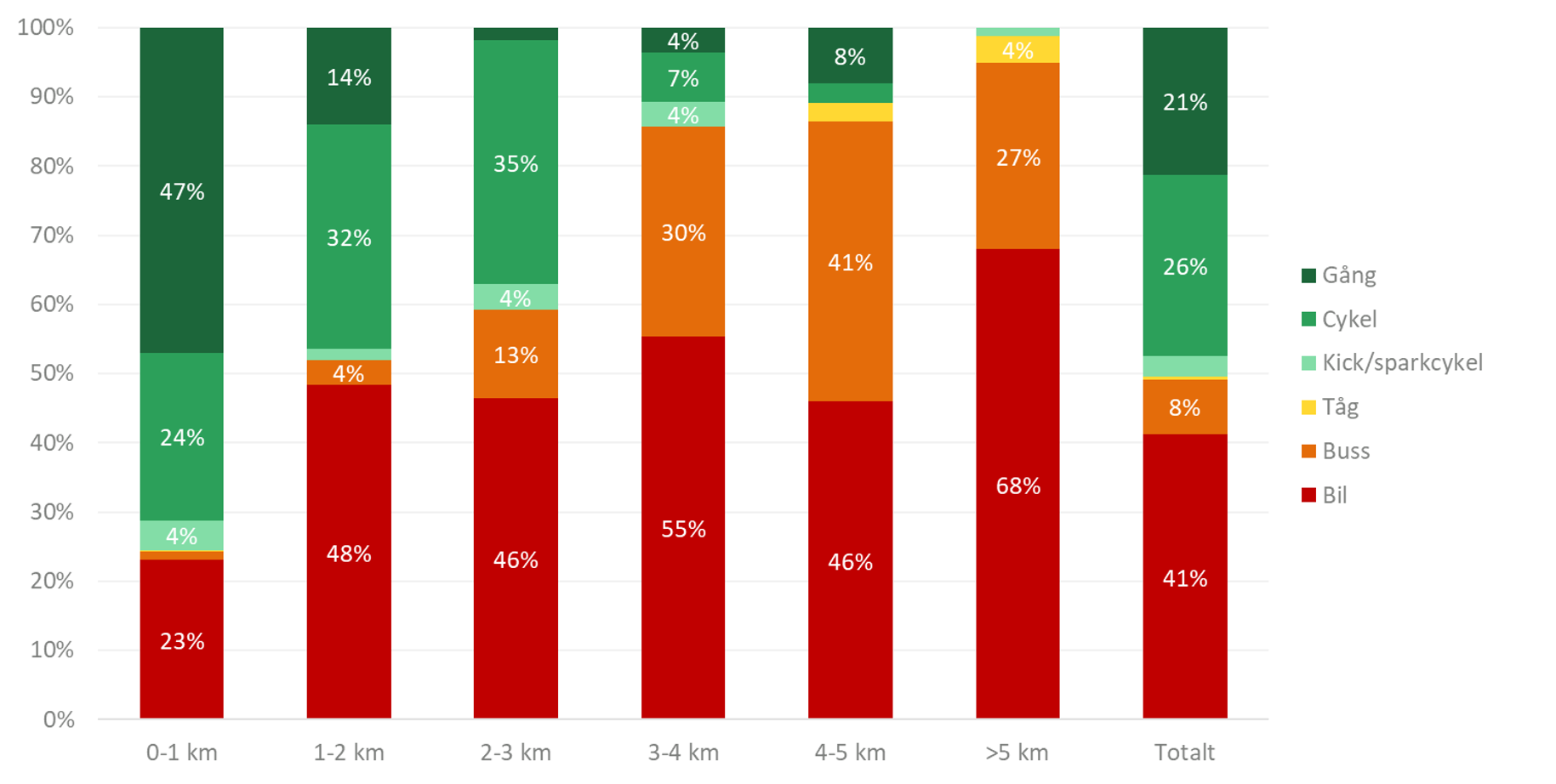 Resultat från projektets mätning baserat på svar från alla fyra skolor. Diagrammet visar hur eleverna reser till skolan beroende på vilket avstånd de har till skolan.