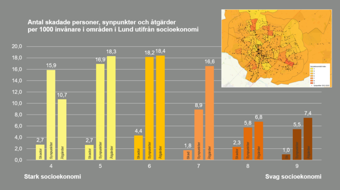 Det finns en förhöjd olycksrisk hos socioekonomiskt svaga grupper och en ojämn fördelning av vilka befolkningsgrupper som adresseras av trafiksäkerhetsåtgärder. I tre kommuner (Lund, Göteborg och Huddinge) har skadade fotgängare och cyklister, medborgares synpunkter på trafiksäkerheten och kommunens trafiksäkerhetsåtgärder för olika områden analyserats genom GIS. Områden som ”hörs mindre”, vilket ofta är socioekonomiskt svaga områden med en hög andel utlandsfödda medborgare, tilldelas generellt också färre åtgärder. Detta är dock inte ett helt självklart samband och ser dock lite olika ut för de studerade kommunerna.