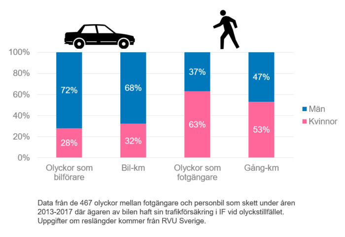 Kvinnor och män uppvisar olika utsatthet som oskyddade trafikanter. Det är en kvinna som blir påkörd i 6 av 10 kollisionsolyckor mellan personbil och fotgängare. Män är de som oftast kör på – i 7 av 10 olyckor är bilföraren en man. Krockvåldet är dessutom mer allvarligt för olyckor med manlig bilförare jämfört med kvinnlig bilförare.